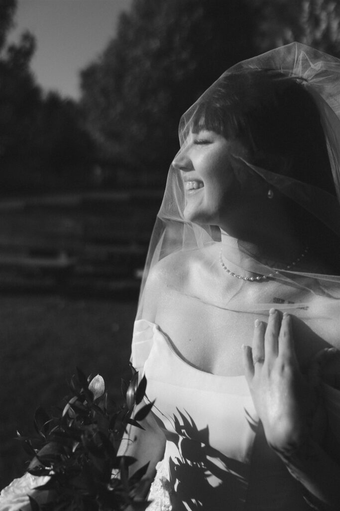 Bride standing outdoors in direct sunlight, eyes closed beneath a sheer veil, holding a white rose bouquet as strong sun creates defined shadows across her dress and arms, demonstrating bold contrast and dimension in wedding lighting photography.